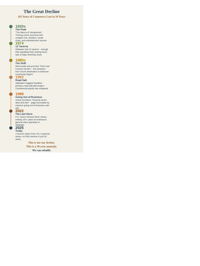 The historical record provides irrefutable proof that Stillwater's current commercial landscape is a departure from its 165-year history. For decades, the township was a dynamic center of commerce and community life. The decline was not a single event, but a long transformation driven by the end of the resort era, the rise of the interstate highway system, and a fundamental shift in the township's demographic and economic purpose.This history is the strongest possible argument for revitalization. It is not about creating something new, but about restoring something that was lost. The evidence shows that Stillwater has the heritage, the charm, and the proven potential to be a destination. The goal of revitalization is to honor this legacy by building a new, modern commercial center that reflects the needs of the 21st-century community, proving that a vibrant town center is not a fantasy, but a return to form.